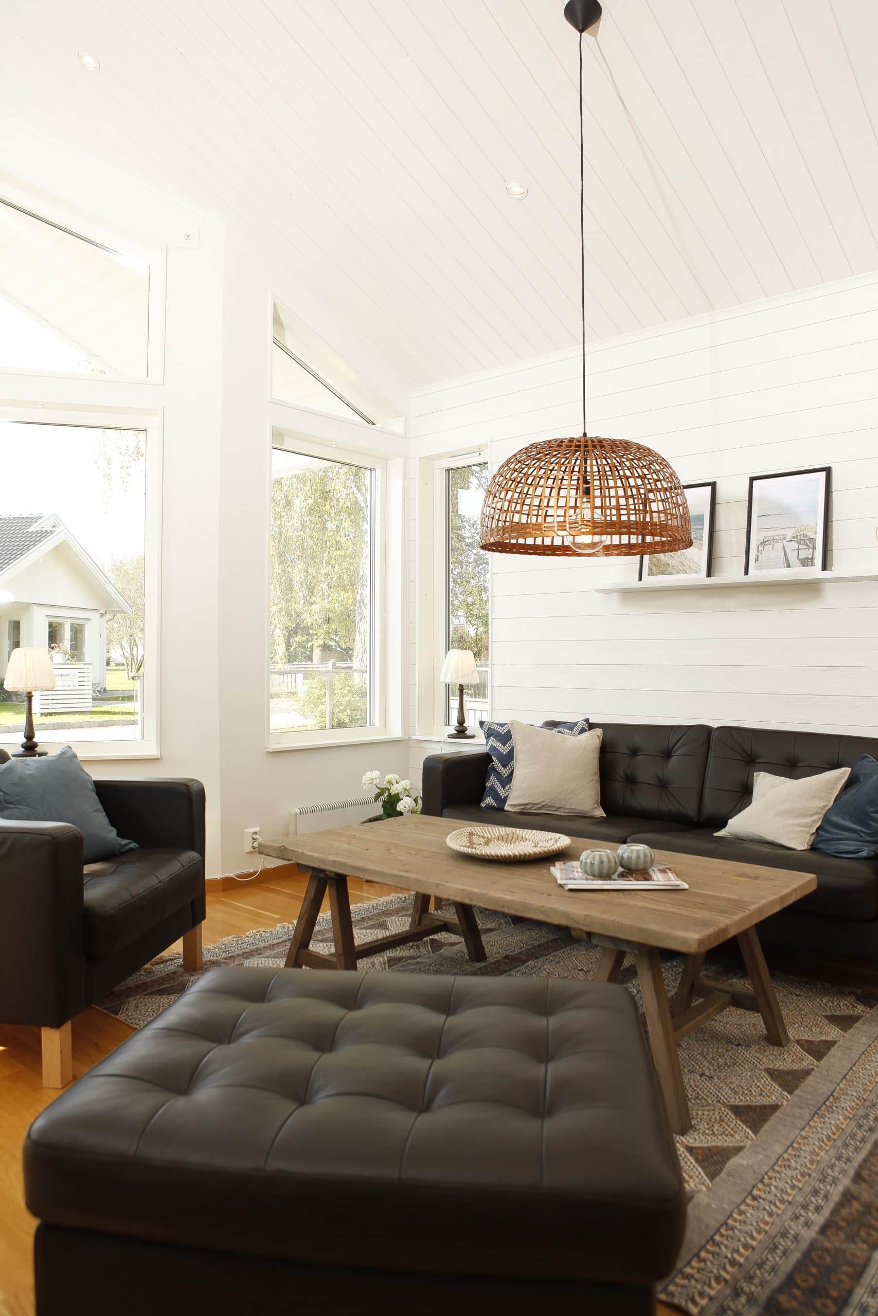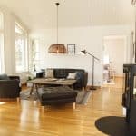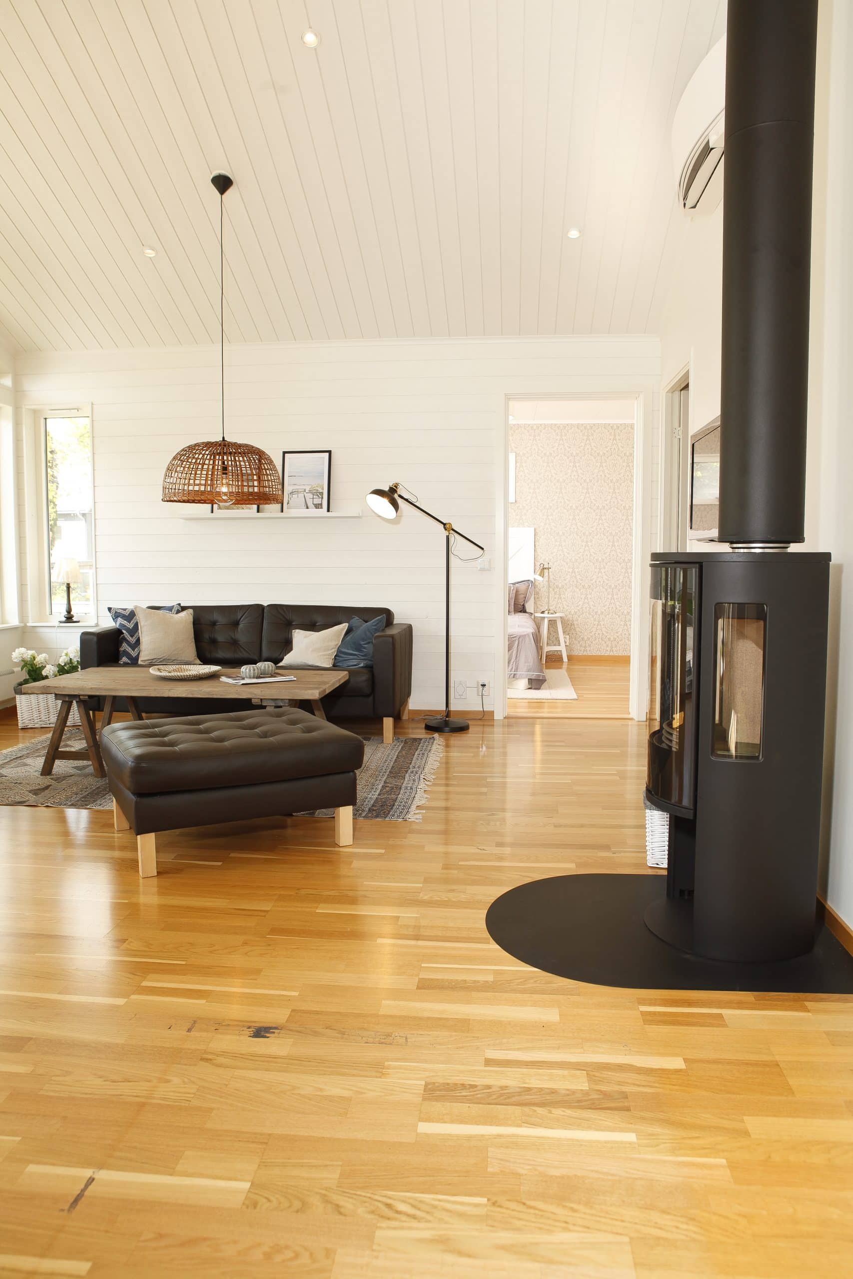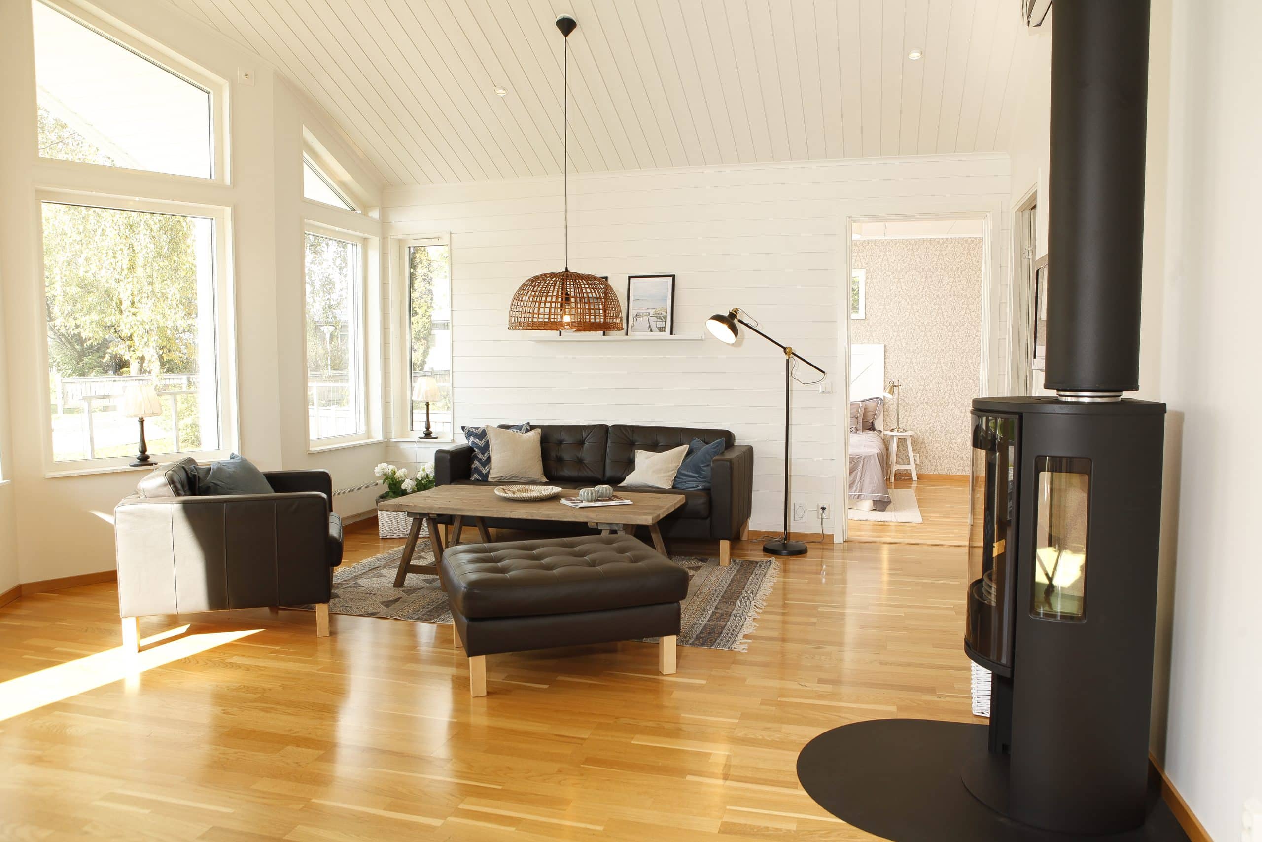 Effekt 97 är ett vackert fritidshus som har en planlösning där kök och vardagsrum är vänt åt samma håll.